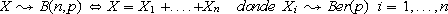 Se dice que una v.a. X sigue una distribución binomial de parámetros n y p, si es la suma de n v.a. Bernouilli independientes e idénticamente distribuidas de parámetro p