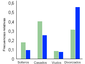 En otras ocasiones tenemos los datos de dos variables y queremos representarlos en un mismo diagrama de barras para compararlos, lo más probable es que no haya el mismo número de observaciones en cada una de ellas, por lo que no sería acertado representar el diagrama de barras con las frecuencias absolutas, en este caso las frecuencias relativas son más adecuadas para su representación.