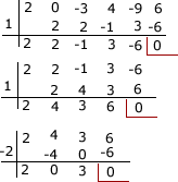 Vamos probando hasta que encontremos un valor cuyo resto es 0, repetimos el proceso con los coeficientes del polinomio cociente hasta que no podamos continuar, porque lleguemos a un polinomio irreducible.
