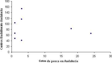 Consideremos el número de Centros de bachillerato que hay en Andalucía, por provincias, y el número de cotos de caza en 2004. No cabe esperar ninguna relación y en la nube de puntos no se observa .