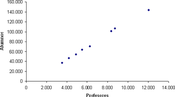 Los datos de la tabla corresponden a los alumnos y profesores en cada una de las provincias de Andalucía en el curso 2004-2005. Con la representación gráfica de la nube de puntos tendremos de un vistazo una noción del comportamiento conjunto de las dos variables. Es claro que tras observar la gráfica se aprecia una relación clara entre el número de alumnos y profesores que hay en una provincia.